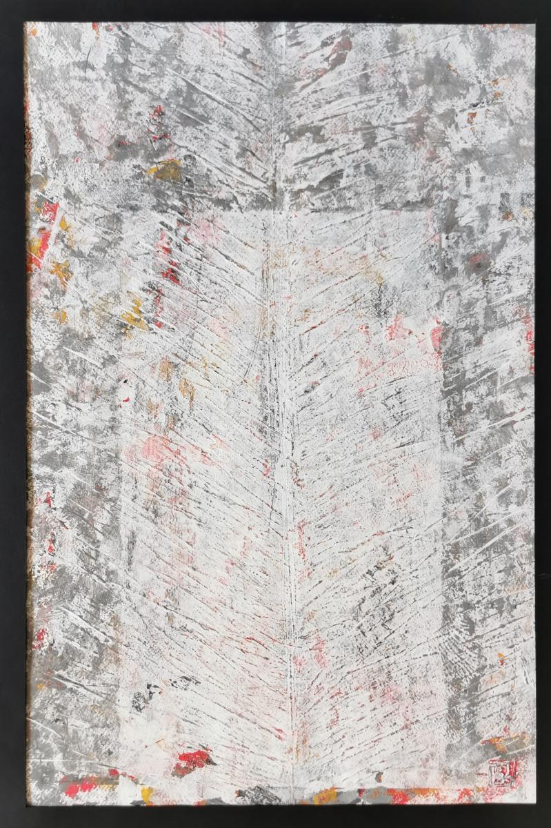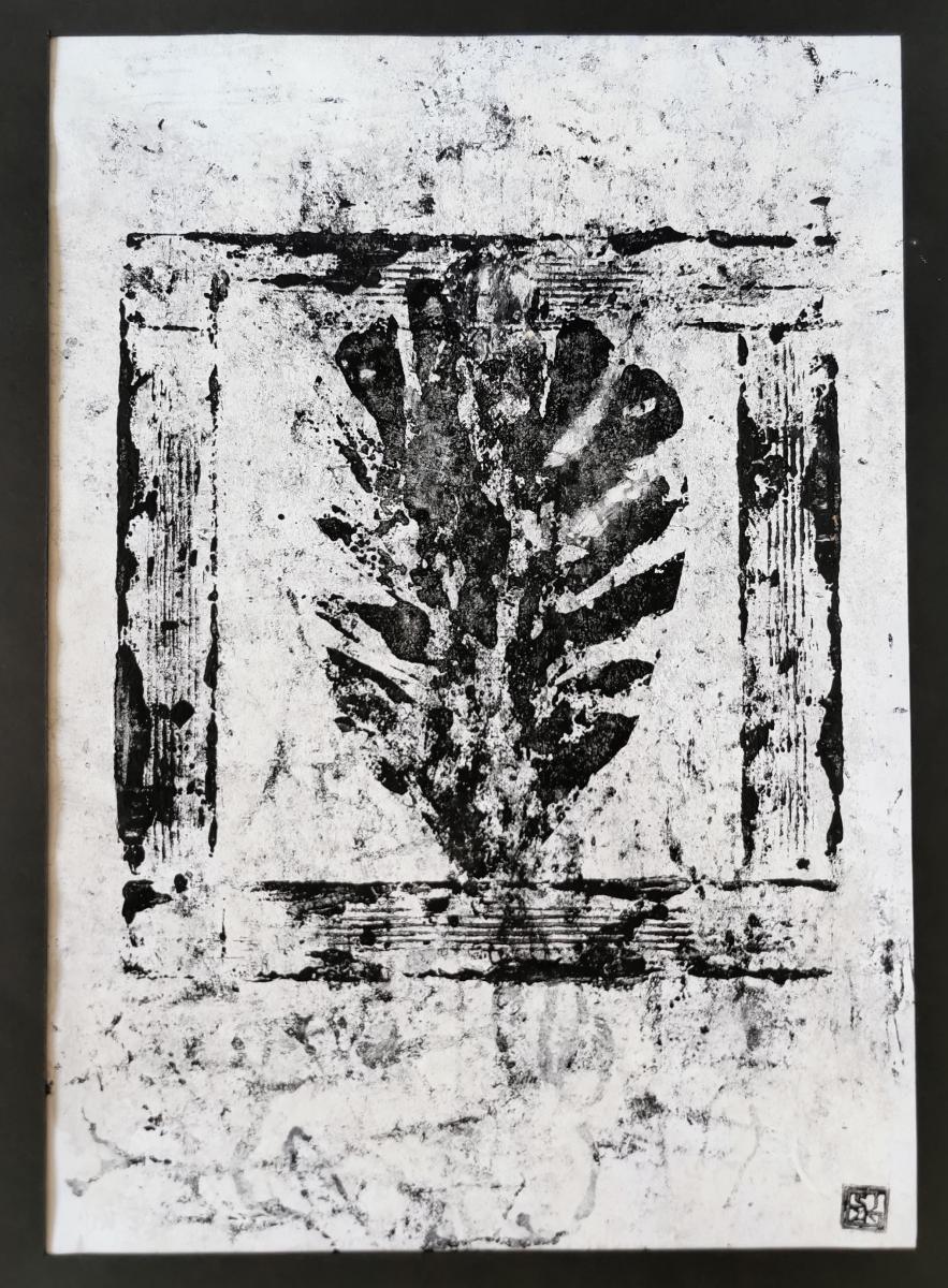 Préselt levél a kert – Pilinszky Fölriadva c. verséhez – papír, tempera-monotípia – 37×52 cm – 2022