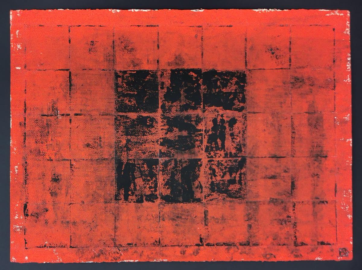 Mondrian kertjében – papír, tempera, tus, monotípia – 50×70 cm – 2022 – magántulajdon