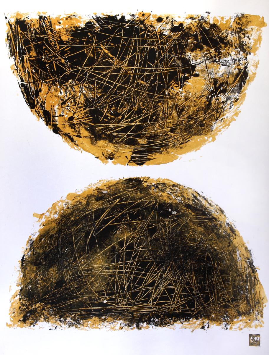 Kertünk felől – Villányi László verséhez – papír, tempera, monotípia – 70×50 cm – 2025